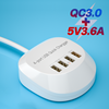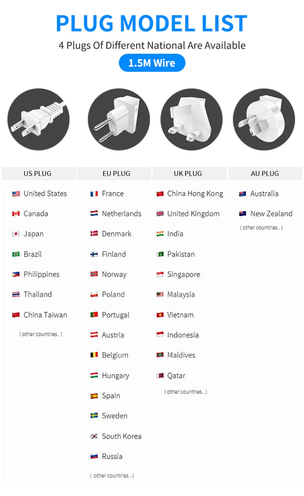 Color: White Material: ABS + PC Output Power : 40W(Max) Input: 100-240V, 50-60HZ Total Output Current : 5V-8A USB A Output: 5V/2.4A Max QC3.0 Output : 5V/3A, 9V/2A, 12V/1.5A Socket Size: 13.8 x 7.5 x 5 cm (L x W x H) Plug Standard: UK plug, US plug, EU Plug, AU Plug (optional)