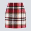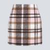 Exude warmth and elegance on chilly winter days in this wool plaid mini skirt. This charming wraparound skirt flaunts classic good looks that make it the picture of wintery sophistication, but leaves enough room for you to play around with your favorite styles and fashion preferences. It has a smart A-line silhouette and closes with a chic circular belt buckle detail at the waist. Two vintage buttons on the belt perfectly complement the stylish plaid print that adorns this brown mini skirt.